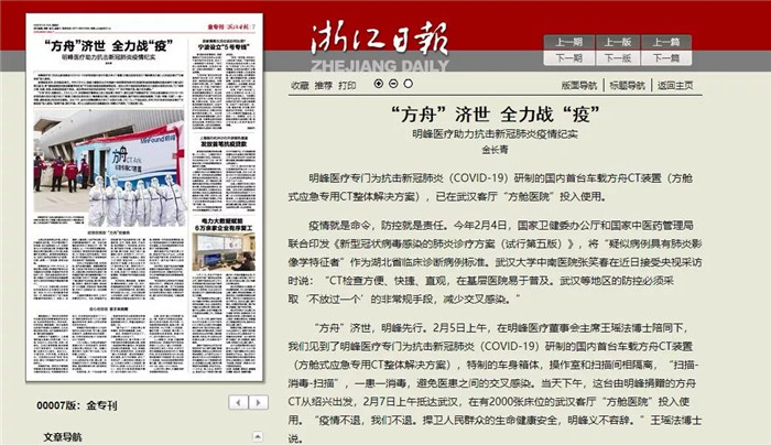 疫情發(fā)生后,今年1月22日,王瑤法博士特意讓明峰醫(yī)療微信公眾號(hào)編發(fā)《抗擊病毒:明峰醫(yī)療和所有醫(yī)護(hù)人員一同抗戰(zhàn)新型肺炎》的文章,并提到了已在河南省全民健康管理中心使用的明峰醫(yī)療集裝箱車載CT。