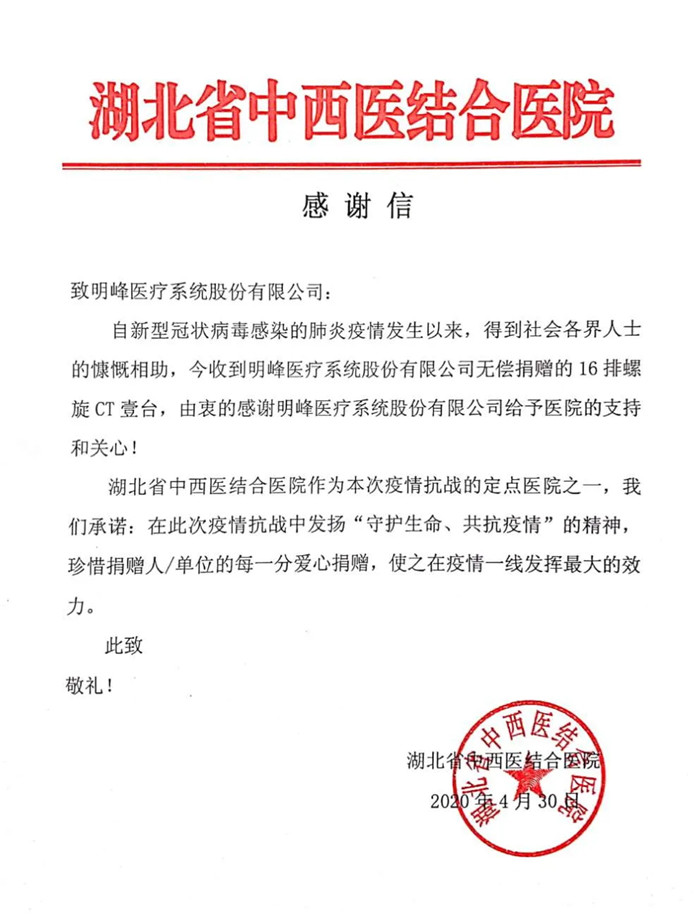 4月30日,湖北省中西醫(yī)結(jié)合醫(yī)院發(fā)來(lái)感謝信,感謝明峰醫(yī)療給予醫(yī)院的支持,無(wú)償捐贈(zèng)一臺(tái)ScintCare CT 16用于抗戰(zhàn)疫情以及今后的醫(yī)療服務(wù)。
