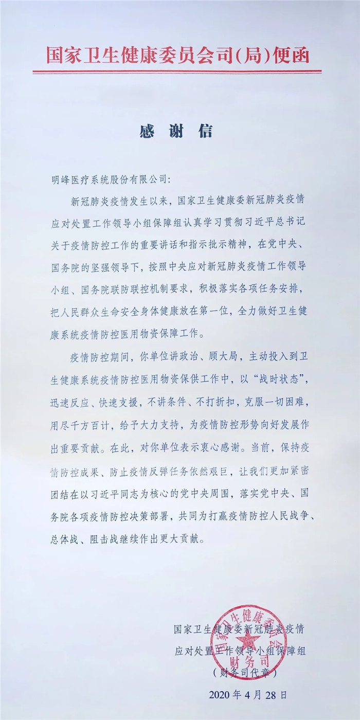 2020年4月28日,國(guó)家衛(wèi)生健康委員會(huì)向明峰醫(yī)療發(fā)來(lái)了感謝信,感謝明峰醫(yī)療講政治、顧大局,主動(dòng)投入到衛(wèi)生健康系統(tǒng)疫情防控醫(yī)用物資保供工作中,以“戰(zhàn)時(shí)狀態(tài)”,迅速反應(yīng)、快速支援,不講條件、不打折扣,克服一切困難,用盡千方百計(jì),給予大力支持,為疫情防控形勢(shì)向好發(fā)展做出重要貢獻(xiàn)。