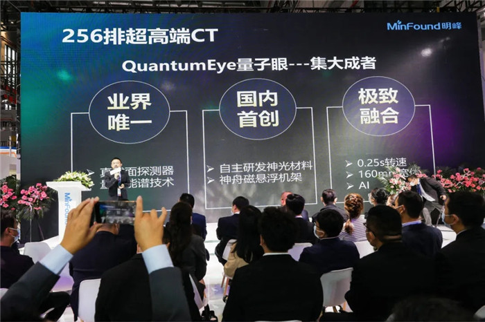 ▲明峰醫(yī)療總裁江浩川發(fā)布國內(nèi)首臺自主研發(fā)超高端256排CT